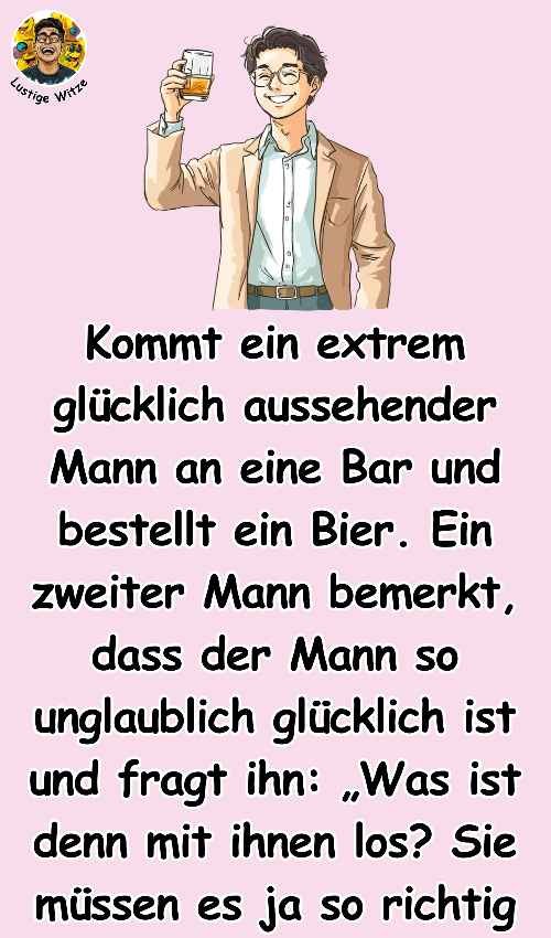 Kommt ein extrem glücklich aussehender Mann an eine Bar und bestellt ein Bier. Ein zweiter Mann bemerkt, dass der Mann so unglaublich glücklich ist und fragt ihn: „Was ist denn mit ihnen los? Sie müssen es ja so richtig gut haben!“.