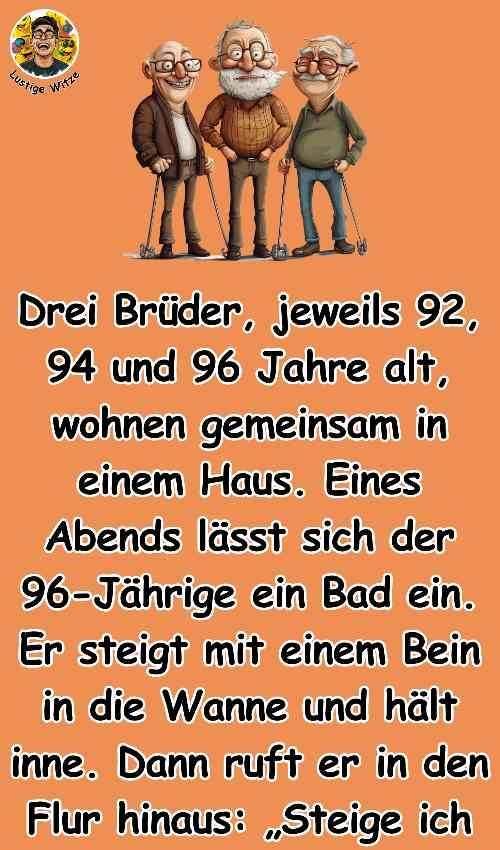Drei Brüder, jeweils 92, 94 und 96 Jahre alt, wohnen gemeinsam in einem Haus. Eines Abends lässt sich der 96-Jährige ein Bad ein. Er steigt mit einem Bein in die Wanne und hält inne. Dann ruft er in den Flur hinaus: „Steige ich gerade in die Wanne rein oder komme ich raus?“