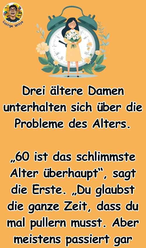 „60 ist das schlimmste Alter überhaupt“, sagt die Erste. „Du glaubst die ganze Zeit, dass du mal pullern musst. Aber meistens passiert gar nichts.“