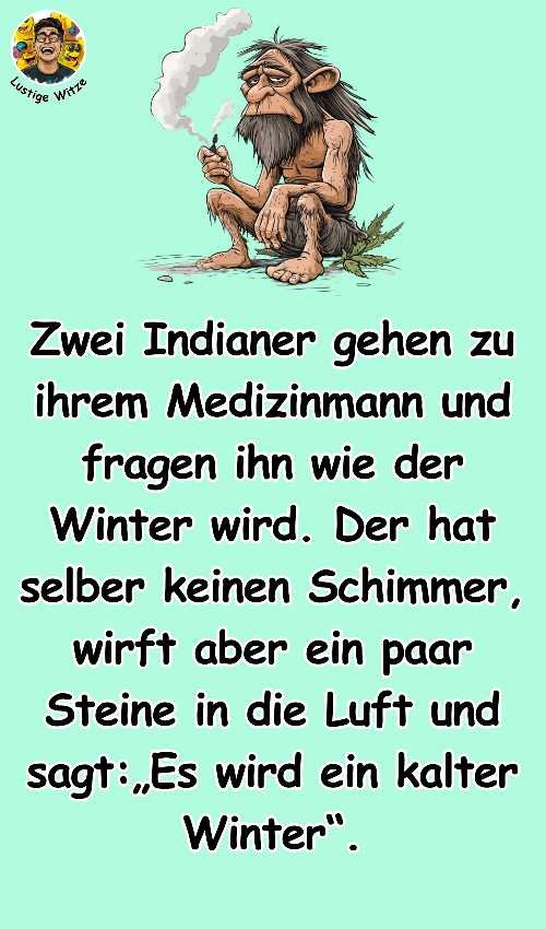 Zwei Indianer gehen zu ihrem Medizinmann und fragen ihn wie der Winter wird. Der hat selber keinen Schimmer, wirft aber ein paar Steine in die Luft und sagt:„Es wird ein kalter Winter“.