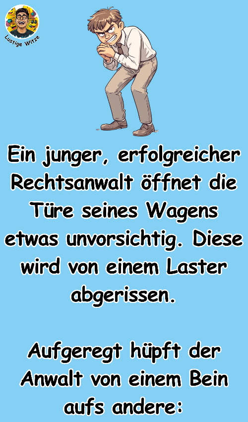 Kopfschüttelnd geht er zu dem Anwalt: “Ihr Anwälte seid so materialistisch, dass Sie vor lauter Aufregung über die Beschädigung an Ihrem BMW nicht mal merken, dass Ihnen der Laster den ganzen Arm abgerissen hat.” Entsetzt blickt der Anwalt auf den Armstumpf.