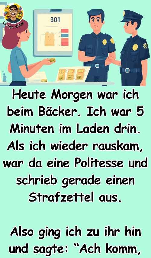 Heute Morgen war ich beim Bäcker. Ich war 5 Minuten im Laden drin. Als ich wieder rauskam, war da eine Politesse und schrieb gerade einen Strafzettel aus.