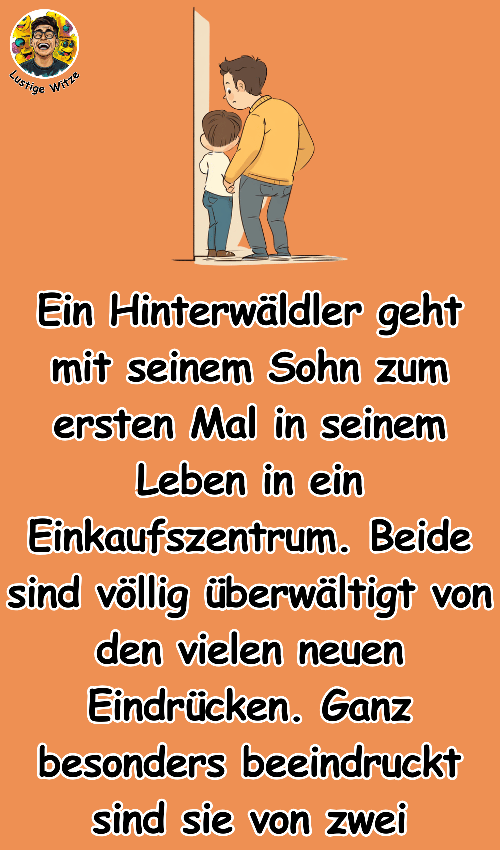 Ein Hinterwäldler geht mit seinem Sohn zum ersten Mal in seinem Leben in ein Einkaufszentrum. Beide sind völlig überwältigt von den vielen neuen Eindrücken. Ganz besonders beeindruckt sind sie von zwei glänzenden Stahltüren im Eingangsbereich, die sich wie von Zauberhand öffnen und schließen.