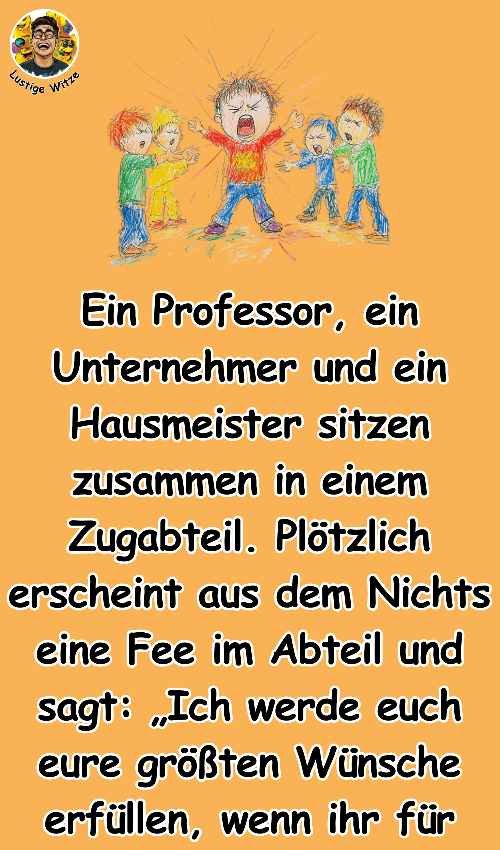 Ein Professor, ein Unternehmer und ein Hausmeister sitzen zusammen in einem Zugabteil. Plötzlich erscheint aus dem Nichts eine Fee im Abteil und sagt: „Ich werde euch eure größten Wünsche erfüllen, wenn ihr für einen Tag die Arbeit eines anderen Menschen erledigt.“