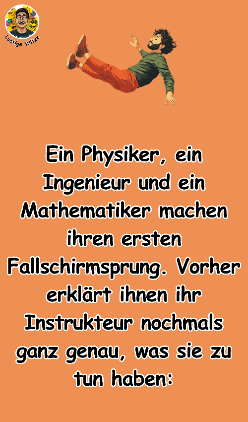 Ein Physiker, ein Ingenieur und ein Mathematiker machen ihren ersten Fallschirmsprung. Vorher erklärt ihnen ihr Instrukteur nochmals ganz genau, was sie zu tun haben: