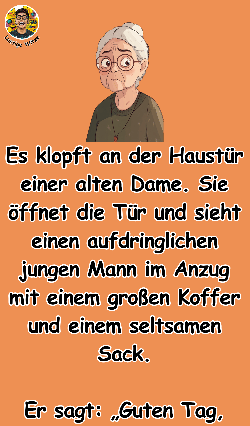 Es klopft an der Haustür einer alten Dame. Sie öffnet die Tür und sieht einen aufdringlichen jungen Mann im Anzug mit einem großen Koffer und einem seltsamen Sack.