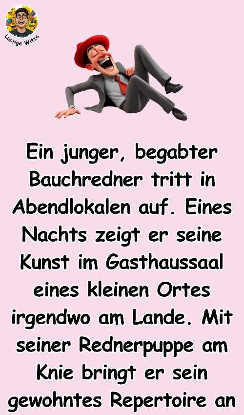 Ein junger, begabter Bauchredner tritt in Abendlokalen auf. Eines Nachts zeigt er seine Kunst im Gasthaussaal eines kleinen Ortes irgendwo am Lande. Mit seiner Rednerpuppe am Knie bringt er sein gewohntes Repertoire an Blondinen Witzen. Einer jungen, hübschen Blondine, in der vierten Reihe sitzend, wird das nach einer kurzen Weile zu bunt.