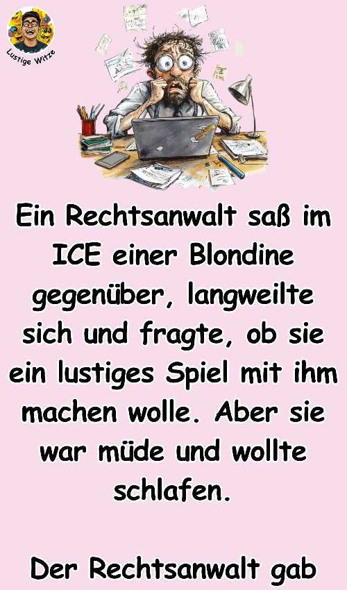 Ein Rechtsanwalt saß im ICE einer Blondine gegenüber, langweilte sich und fragte, ob sie ein lustiges Spiel mit ihm machen wolle. Aber sie war müde und wollte schlafen.