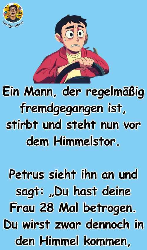 Petrus sieht ihn an und sagt: „Du hast deine Frau 28 Mal betrogen. Du wirst zwar dennoch in den Himmel kommen, aber du bekommst kein nagelneues Auto – im Gegensatz zu den Menschen, die in ihrer Ehe treu geblieben sind!“