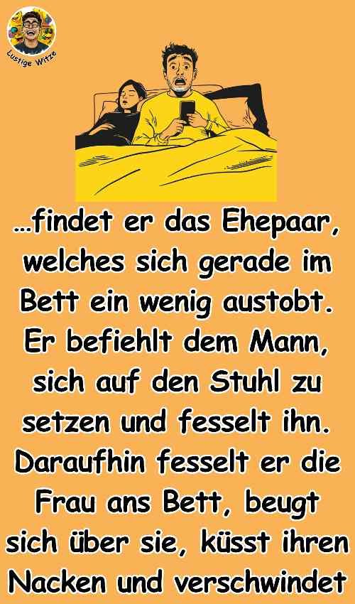 Daraufhin seine Frau: „Er hat meinen Nacken nicht geküsst, er hat mir nur was ins Ohr geflüstert. Er sagt, er sei lange im Knast gewesen und inzwischen schwul geworden. Er sagt, dass du ihm gefällst und fragte, ob wir Vaseline im Haus hätten. Ich sagte ihm, dass er im Bad welche findet. Sei stark Schatz. Ich liebe dich auch!“