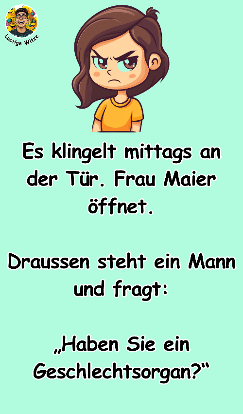 Die Frau knallt die Tür erneut zu. Als sich am darauffolgenden Tag das gleiche Spiel nochmal wiederholt, erzählt Frau Maier ihrem Mann von diesem Vorfall. „Na warte, den Kerl knöpf ich mir vor“, erwidert der Ehemann wütend. „Morgen werde ich mich hinter der Tür verstecken und wenn der dich dann blöd anmacht, gibt’s Saures.“