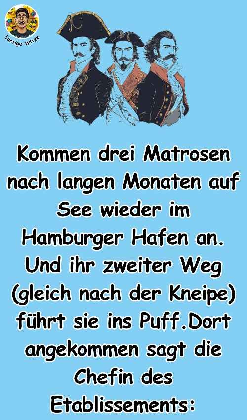 Kommen drei Matrosen nach langen Monaten auf See wieder im Hamburger Hafen an. Und ihr zweiter Weg (gleich nach der Kneipe) führt sie ins Puff.Dort angekommen sagt die Chefin des Etablissements: