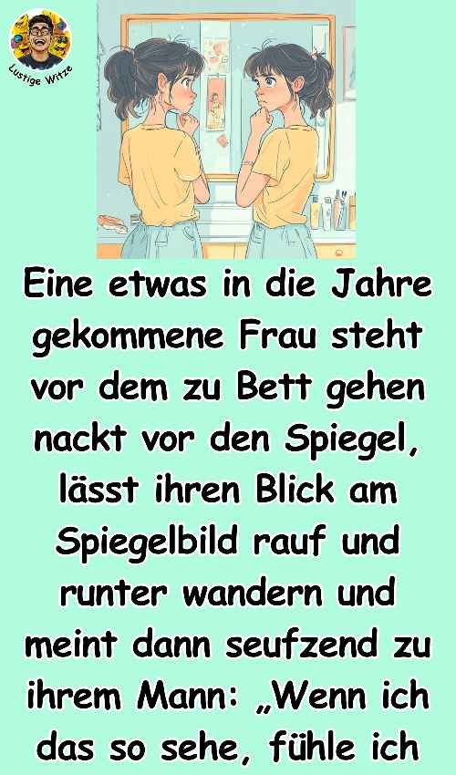 Eine etwas in die Jahre gekommene Frau steht vor dem zu Bett gehen nackt vor den Spiegel, lässt ihren Blick am Spiegelbild rauf und runter wandern und meint dann seufzend zu ihrem Mann: „Wenn ich das so sehe, fühle ich mich sehr alt. Meine Haut ist schrumpelig und schlapp, meine Brüste hängen beinahe bis zur Hüfte und mein Hintern ist total dick geworden“