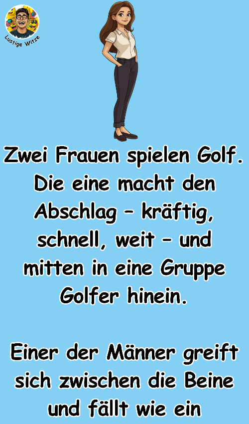 Zwei Frauen spielen Golf. Die eine macht den Abschlag – kräftig, schnell, weit – und mitten in eine Gruppe Golfer hinein.