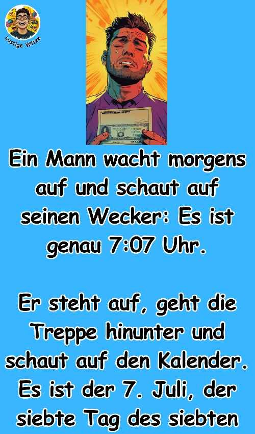 Ein Mann wacht morgens auf und schaut auf seinen Wecker: Es ist genau 7:07 Uhr.