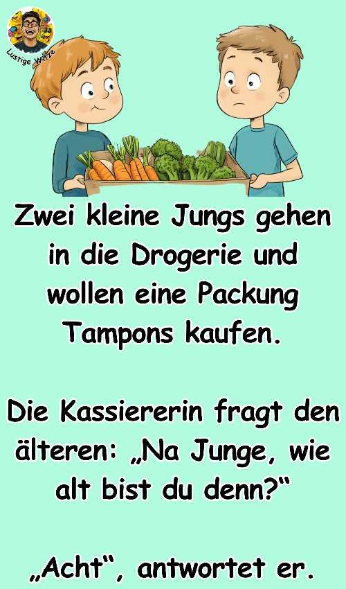 Zwei kleine Jungs gehen in die Drogerie und wollen eine Packung Tampons kaufen.