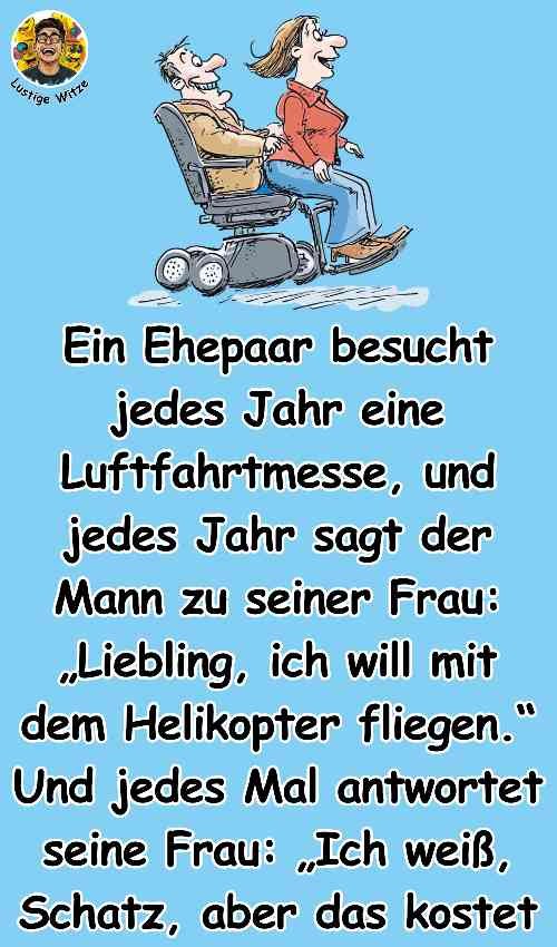 Ein Ehepaar besucht jedes Jahr eine Luftfahrtmesse, und jedes Jahr sagt der Mann zu seiner Frau: „Liebling, ich will mit dem Helikopter fliegen.“ Und jedes Mal antwortet seine Frau: „Ich weiß, Schatz, aber das kostet 50 Euro, und 50 Euro sind 50 Euro!“