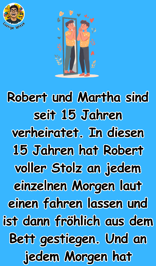 Robert und Martha sind seit 15 Jahren verheiratet. In diesen 15 Jahren hat Robert voller Stolz an jedem einzelnen Morgen laut einen fahren lassen und ist dann fröhlich aus dem Bett gestiegen. Und an jedem Morgen hat Martha zu ihm gesagt, dass ihm dabei eines Tages die Gedärme rausfallen werden. Aber das war ihm egal. Ohne Rücksicht auf seine Frau behielt er seine morgendliche Furz-Routine bei.
