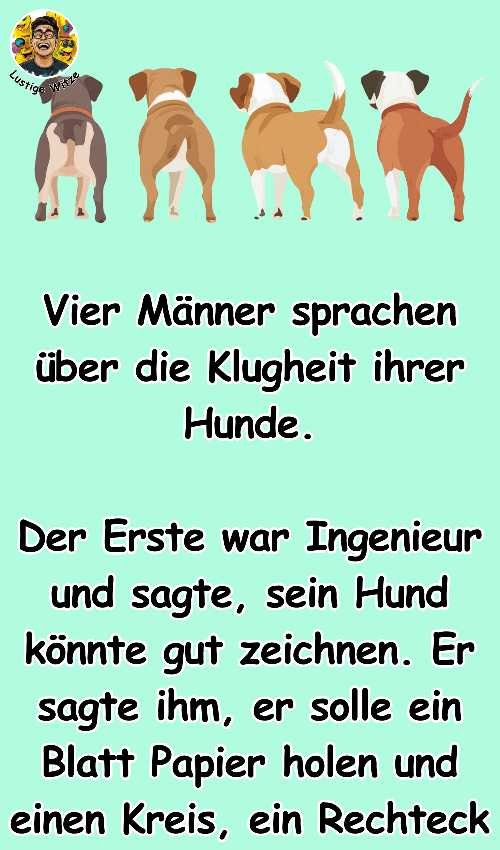 Der Erste war Ingenieur und sagte, sein Hund könnte gut zeichnen. Er sagte ihm, er solle ein Blatt Papier holen und einen Kreis, ein Rechteck und ein Dreieck zeichnen, was der Hund auch leicht schaffte.