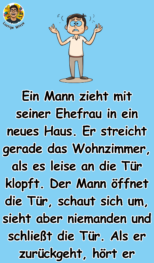 Ein Mann zieht mit seiner Ehefrau in ein neues Haus. Er streicht gerade das Wohnzimmer, als es leise an die Tür klopft. Der Mann öffnet die Tür, schaut sich um, sieht aber niemanden und schließt die Tür. Als er zurückgeht, hört er wieder ein leises Klopfen. Der Mann öffnet die Tür, schaut sich um, schaut nach unten und sieht eine Schnecke. Da er keine Schädlinge auf seinem Grundstück haben will, hebt er die Schnecke hoch und wirft sie weg – so weit, wie er kann. Dann wischt er sich die Hände ab und geht zurück ins Haus.