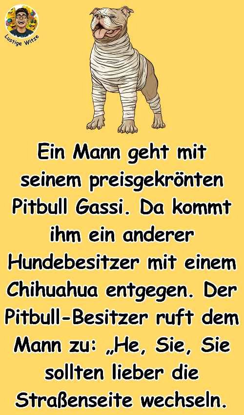 Ein Mann geht mit seinem preisgekrönten Pitbull Gassi. Da kommt ihm ein anderer Hundebesitzer mit einem Chihuahua entgegen. Der Pitbull-Besitzer ruft dem Mann zu: „He, Sie, Sie sollten lieber die Straßenseite wechseln. Mein Pitbull ist zum Kämpfen abgerichtet und wird ihren Fiffi in Stücke reißen!“