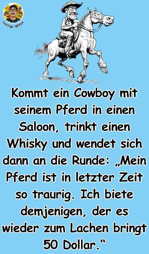 Kommt ein Cowboy mit seinem Pferd in einen Saloon, trinkt einen Whisky und wendet sich dann an die Runde: „Mein Pferd ist in letzter Zeit so traurig. Ich biete demjenigen, der es wieder zum Lachen bringt 50 Dollar.“